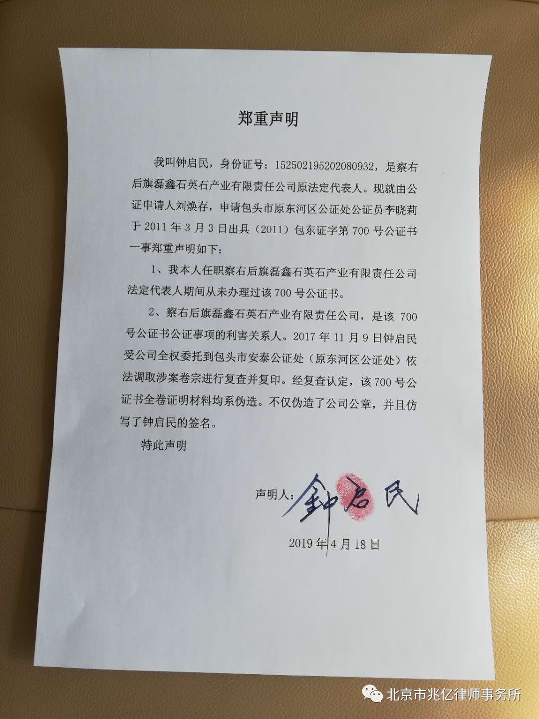 据当事人钟先生讲:在该公司已经彻底清偿刘某合同借款并且已经多给付其300多万元的前提下,不到三个月公司收到刘某当地法院一整套法律文书,即法院强制执行裁定书。刘某作为强制执行申请人申请强制执行磊鑫公司200万元,而执行法院却强制执行公司300万元资产。关键是直到此时公司才发现刘某依据两份借款合同(已经履行完毕),即一份是已经自行作废无效的4992号公证书,另一份是刘某与公证员合伙共同伪造的一份所谓700号公证书作为所谓“依据”,由公证处及公证员出具了一份不真实、不合法的(2011)包安泰证执字第013号执行证书。执行法院就是依据这份虚假013号执行证书对公司进行错误的强制执行。然而磊鑫公司对700号公证书毫不知情,随着不断收集查找证据,钟先生发现700号公证书至少有3种版本,其中一种版本居然没有公证员的印章。由刘某出具一式两份的所谓“民间借贷合同”竟然原件就有五份之多。这不仅完全有悖客观事实,违反相关律规定。而且漏洞百出、破绽累累。基于公证机关和承办法院有关国家公职人员和公权力持有者肆意违法出证、办案,公司于2012年4月全权委托钟先生向自治区检察院进行实名举报。区检察院受理后于2012年6月将案件交由包头市检察院负责侦办此案,包头市检察院办案人员对公证书中民间借贷合同上钟先生的签名进行司法鉴定,鉴定结论,钟先生的签字非本人书写。此时涉案公证员被依法逮捕后取保候审,案件在包头市检察院侦查办进入关键阶段,不知接到来自何方的指示案件被移交到另一基层检察院重新侦办。期间,另一检察院对原本与公证员无直接关系的问题却由涉案公证员提出重新鉴定申请,办案机关历时6个多月后竟然出具两份鉴定书,鉴定结论居然与包头市检察院第一时间鉴定结论截然相反。致使涉案问题变得扑朔迷离、古怪稀奇。